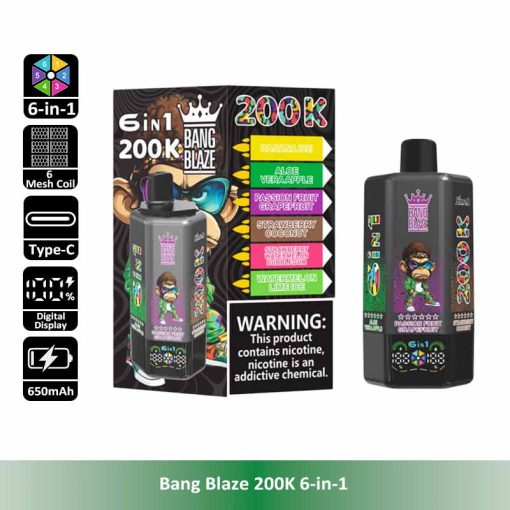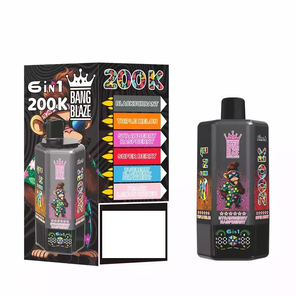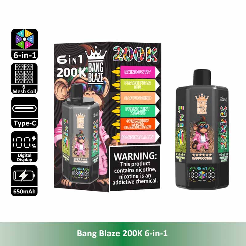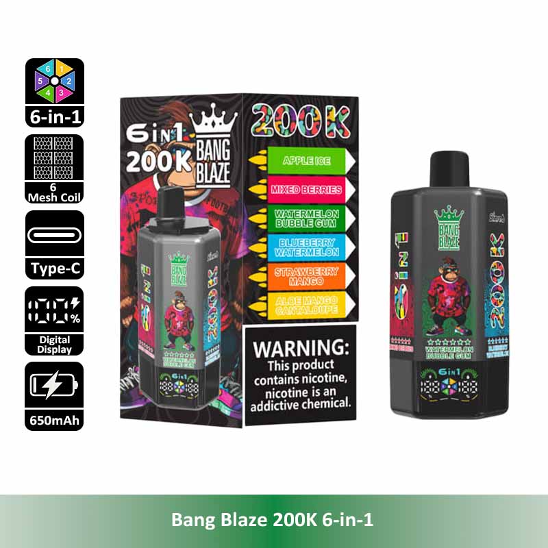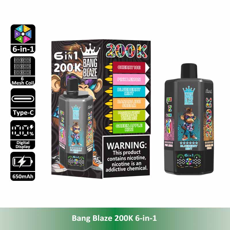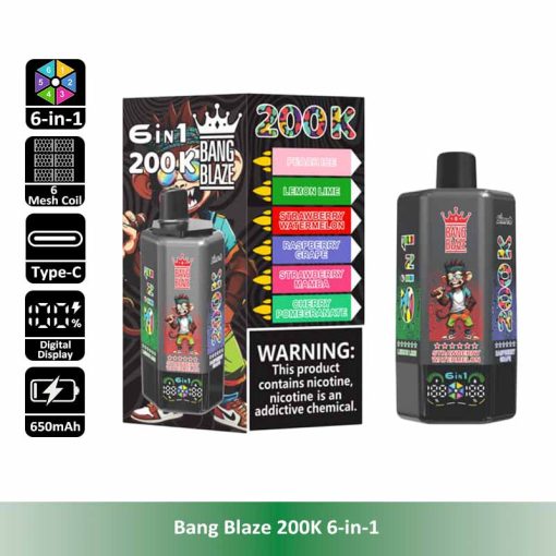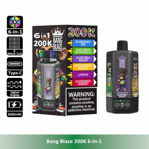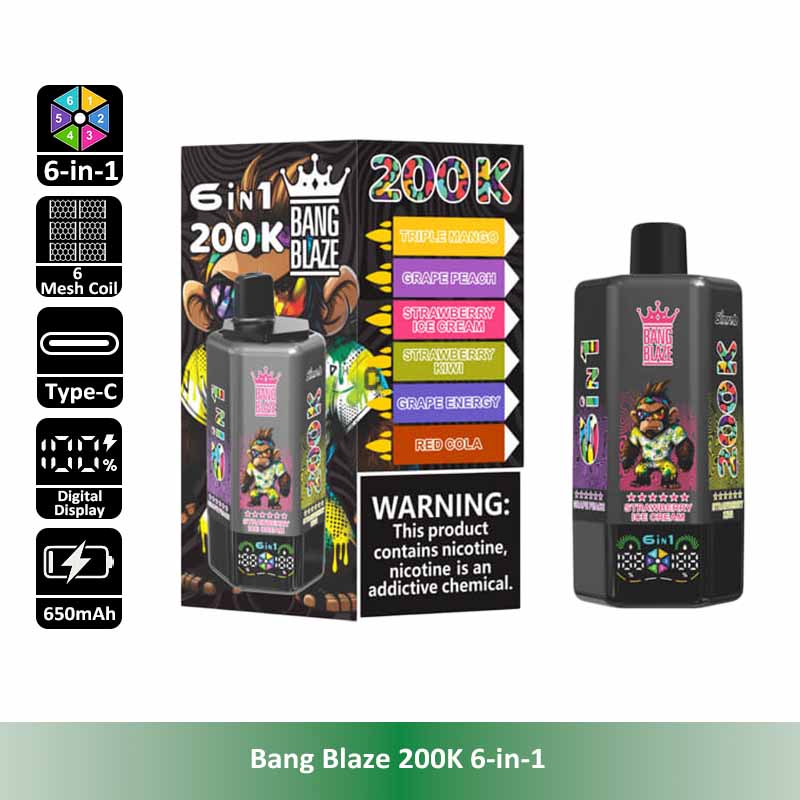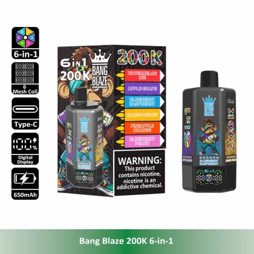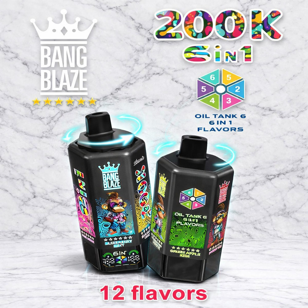 Introducing the Bang Blaze 200K 6-in-1, the all-in-one disposable vape designed for ultimate convenience and long-lasting performance. With an industry-leading 200,000 puff count, six separate pre-filled flavor tanks, and a smooth rotating flavor switch, this device redefines portability and variety. It features a reliable 600mAh rechargeable battery with Type-C fast charging, leak-proof structure, and multiple nicotine strengths to satisfy different preferences.